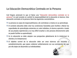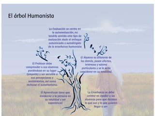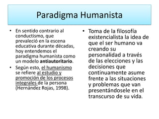 El documento presenta cuatro paradigmas educativos: conductista, cognitivo, humanista y constructivista. El paradigma humanista se centra en el desarrollo integral de la persona, su autorrealización y crecimiento personal a través de la toma de decisiones. El educador humanista ayuda a los estudiantes a descubrir quiénes son y lo que quieren ser, respetando sus diferencias individuales.