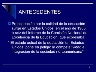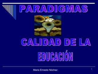 El documento presenta una revisión de los diferentes paradigmas o enfoques sobre la calidad de la educación que han existido a lo largo del tiempo. Comienza describiendo los antecedentes sobre cómo surgió el interés por la calidad de la educación en Estados Unidos y su discusión a nivel internacional en las décadas de 1980 y 1990. Luego explica nueve paradigmas o enfoques diferentes sobre cómo se ha entendido el concepto de calidad educativa, como cobertura, prestigio, rendimiento académico, gestión pedagógica, entre otros.