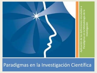 Este documento define los paradigmas en investigación científica y describe las características de los paradigmas positivista e interpretativo. Define un paradigma como un conjunto de creencias y valores compartidos por una comunidad científica que determinan cómo se resuelven problemas. Luego compara las características de los enfoques cuantitativo y cualitativo en términos de sus fundamentos, objetivos, relación sujeto-objeto, y métodos de recolección y análisis de datos. Finalmente, resume el proceso de investigación según cada paradigma.