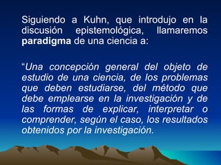 Este documento describe los dos principales paradigmas en investigación social: el paradigma explicativo y el paradigma interpretativo. El paradigma explicativo se basa en el empirismo y realismo científico, buscando explicar fenómenos a través de la descripción de relaciones y generalizaciones. El paradigma interpretativo se basa en el idealismo, argumentando que existen múltiples realidades construidas subjetivamente y buscando comprender los significados que los actores dan a sus acciones.