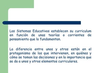 El documento describe tres paradigmas curriculares: el paradigma técnico/positivista, el paradigma práctico/fenomenológico y el paradigma estratégico/sociocrítico. Cada paradigma se define por su finalidad, concepción de la realidad, relación sujeto-objeto, generalización, explicación y metodología y materiales utilizados. El documento también describe que la evaluación educativa debe proporcionar información fiable para fundamentar decisiones y prácticas docentes que favorezcan y mejoren el aprendizaje