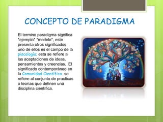 Este documento discute varios paradigmas educativos incluyendo el paradigma conductual, contextual, cognitivo y constructivista. Explica que el paradigma conductual ve a los estudiantes y maestros como máquinas, mientras que el paradigma cognitivo ve a los estudiantes como sujetos activos. También menciona a investigadores clave como Kuhn, Piaget, Vigotsky y Ausubel y cómo contribuyeron a diferentes paradigmas. Finalmente, discute la importancia de la investigación educativa y el aprendizaje basado en competencias.