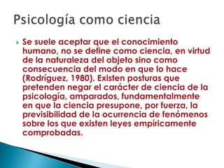 El documento discute diferentes paradigmas y enfoques en psicología. Brevemente describe el paradigma conductista, el psicoanalítico enfocado en los deseos e inconsciente, y el paradigma psicobiológico que estudia la relación entre la conducta y los procesos cerebrales. También menciona el enfoque humanista que considera al ser humano como único e irrepetible y se enfoca en su creatividad y desarrollo personal.