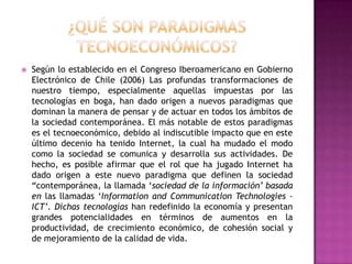 El documento discute el surgimiento de las tecnologías de la información y la comunicación (TIC) y su impacto en la economía y sociedad. Explica que Internet ha transformado la forma en que las personas se comunican y realizan actividades, dando origen a una nueva sociedad basada en la información. También describe cómo las TIC han redefinido la economía y presentan oportunidades para aumentar la productividad y el crecimiento económico.