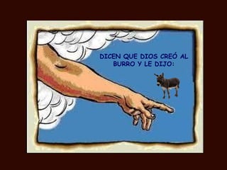 El documento cuenta una historia ficticia sobre cómo Dios creó diferentes animales y les asignó una vida útil específica. Al crear al hombre, este negocia con Dios para obtener la vida útil adicional que los otros animales habían rechazado, resultando en que el hombre vive primero 30 años como hombre, luego 15 años como burro trabajando, 10 años como perro jubilado y 5 años como mono divirtiendo a los nietos.