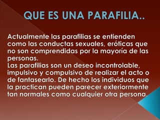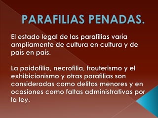 El documento habla sobre las parafílias desde la perspectiva de Freud. Explica que las parafílias se originan en los instintos infantiles de autoerotismo y que factores inconscientes como el deseo de poder, el riesgo y el desquite pueden llevar a satisfacer la libido a través de actividades no genitales. Menciona varios tipos de parafílias como la paidofilia, necrofilia y exhibicionismo.