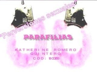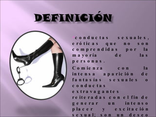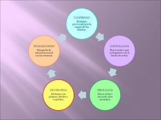 El documento describe varias parafilias o patrones alterados de la sexualidad, incluyendo el sadismo, voyeurismo, zoofilia, coprofilia y necrofilia. También describe factores relacionados con patrones alterados de la sexualidad como déficit de conocimiento, falta de intimidad y modelos funcionales ineficaces o ausentes. Finalmente, recomienda tratamientos como la administración de medicamentos, apoyo emocional, asesoramiento sexual, modificación de la conducta y autocontrol de la conducta.