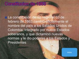 La constitución de 1863 cambió el nombre del país a Estados Unidos de Colombia e introdujo nuevas normas para limitar el poder del presidente y dar más autoridad a los estados. La constitución de 1886, impulsada por los regeneradores, buscó establecer un equilibrio entre el poder del estado y las libertades individuales. Esta constitución rigió la vida constitucional de Colombia desde finales del siglo XIX hasta 1991. La constitución de 1863 otorgó varias libertades civiles pero también reconoció a la iglesia católica.