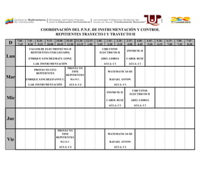Este documento presenta el horario de clases para los estudiantes que repiten el primer y segundo trayecto del programa de Instrumentación y Control. Incluye las asignaturas, profesores, aulas y horarios para las clases de lunes a viernes de 7:00 a 8:30.