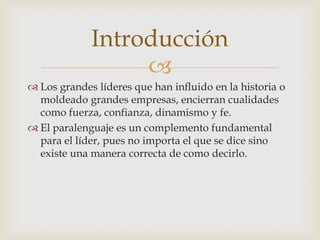 El documento describe el paralenguaje y su importancia para el liderazgo. Explica que el paralenguaje incluye la entonación, volumen, ritmo y dicción al hablar, y factores como la distribución espacial y tipografía al escribir. Resalta que los líderes efectivos controlan su respiración y hablan a un ritmo sosegado para ser bien comprendidos.