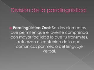 La paralingüística estudia los elementos que acompañan a la comunicación oral y escrita como señales adicionales de información, incluyendo la paralingüística oral que refuerza el contenido verbal a través del tono y ritmo, y la paralingüística escrita que transmite emociones a través de mayúsculas, signos de puntuación y tipografía.