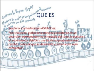 La parálisis cerebral infantil es un trastorno permanente del tono muscular, la postura y el movimiento causado por una lesión en el cerebro antes del desarrollo completo. Puede causar hemiplejia, diplejia o tetraplejia. Sus causas incluyen daños prenatales, perinatales o postnatales como infecciones, parto prematuro, encefalitis o falta de oxígeno. La parálisis cerebral se puede detectar desde el nacimiento o durante los primeros años de vida a través de signos precoces o síntomas le