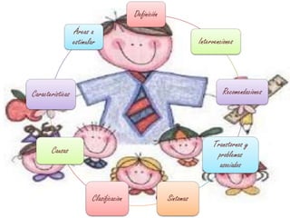 Este documento proporciona una definición detallada de la parálisis cerebral, incluyendo sus causas, síntomas, clasificaciones y recomendaciones de tratamiento. La parálisis cerebral es un trastorno motor no progresivo causado por una lesión cerebral antes, durante o después del nacimiento. Puede causar problemas de movimiento, tono muscular y equilibrio. Se clasifica según la ubicación y gravedad de la lesión cerebral. El tratamiento implica un enfoque multidisciplinario que estimula áreas como la motricidad, el len