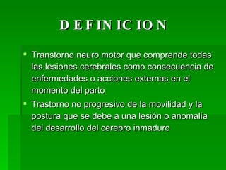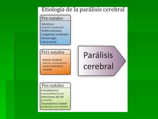 La parálisis cerebral es un trastorno del movimiento causado por una lesión cerebral que ocurre durante el desarrollo del cerebro. Puede ser resultado de eventos prenatales, perinatales o posnatales como infecciones, traumas durante el parto, o hipoxia. Existen diferentes tipos dependiendo de la ubicación y grado de daño cerebral. Además de problemas motrices, puede causar trastornos asociados como retraso mental, problemas sensoriales y de alimentación. El tratamiento incluye terapia temprana para mejorar la movilidad