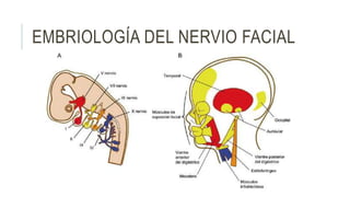 El documento describe la anatomía, fisiología, etiología y clasificación de la parálisis facial. Explica que el nervio facial se origina en el tronco encefálico y recorre cuatro porciones hasta su terminación. Las causas más comunes de parálisis facial son infecciones virales y fallas microcirculatorias. Se clasifican las parálisis faciales en espontáneas, traumáticas, congénitas y asociadas a otras enfermedades.