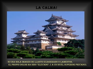 El documento describe la respuesta ejemplar del pueblo japonés al terremoto y tsunami de 2011, destacando su calma, dignidad, habilidad, orden, sacrificio, ternura y entrenamiento ante la tragedia, así como la moderación de la prensa y la conciencia ciudadana. La lección principal es que Japón ofrece un ejemplo para el mundo de cómo afrontar una catástrofe de forma disciplinada y solidaria.