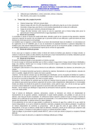 Este documento presenta los términos de referencia para la ejecución de estudios hidrosanitarios en viviendas, edificaciones y comercios. Describe los requisitos para el diseño de sistemas de agua potable, incluyendo el cálculo de reservas, acometidas, presión y redes internas, así como para el diseño de sistemas de desagüe sanitario, pluvial y combinado. También presenta parámetros mínimos para el cálculo de bajantes de aguas servidas y la intensidad de lluv