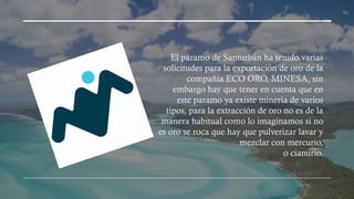 El Paramo de Santurbán es uno de los lugares más importantes de Colombia. Alberga una gran diversidad de flora, fauna y lagunas. Varias compañías han solicitado exportar oro de la región mediante la minería, la cual involucra pulverizar roca y mezclarla con mercurio o cianuro. Sin embargo, la minería perjudicaría el paramo y sus fuentes de agua, contraviniendo la legislación. Mientras que la minería puede beneficiar la economía y empleo, también contamina el paramo, del cual