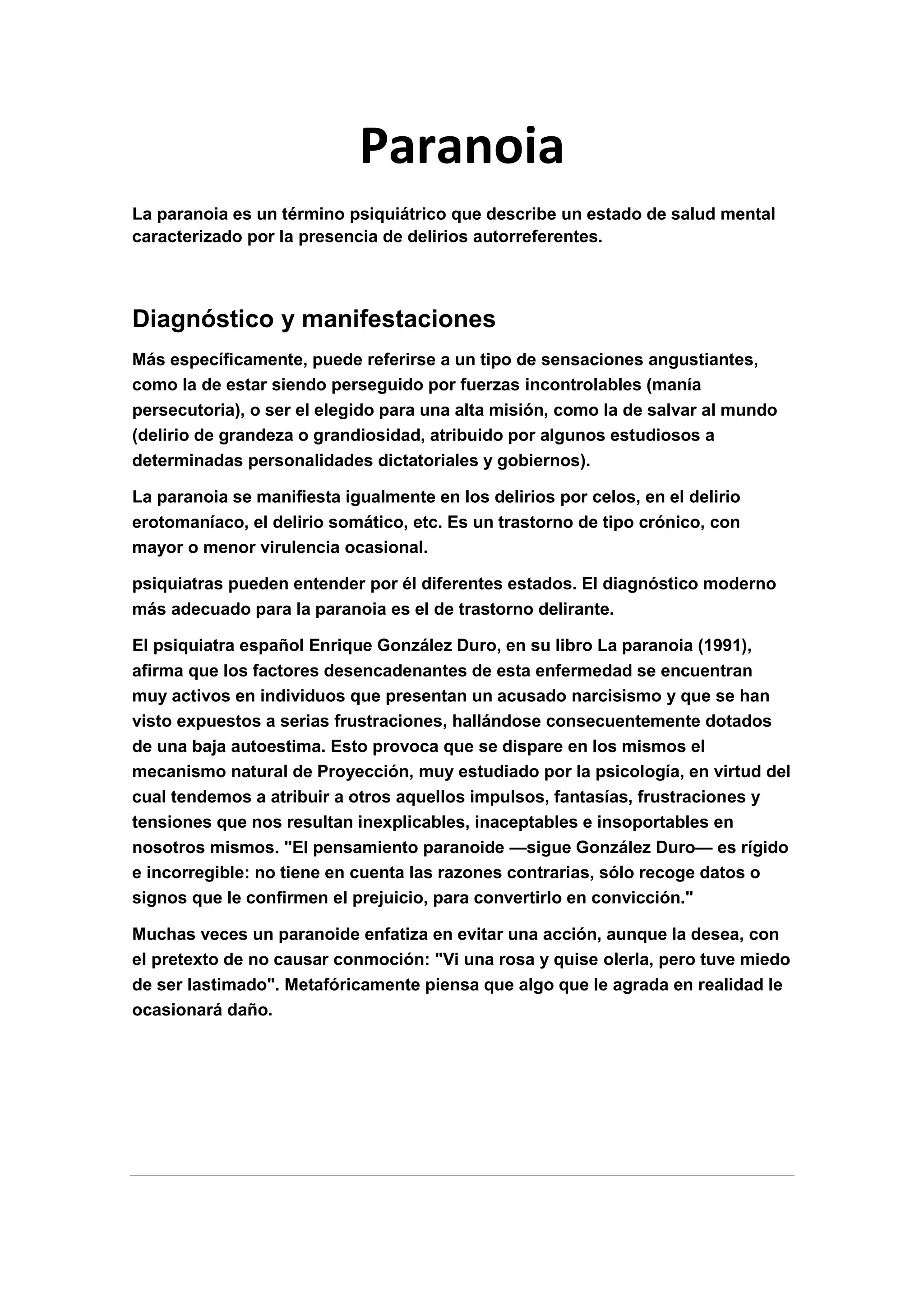 La paranoia es un trastorno mental caracterizado por delirios de persecución o de grandeza. Se manifiesta a través de delirios de celos, erotomanía u otros. Es un trastorno crónico con períodos de mayor o menor gravedad. El diagnóstico moderno más adecuado es el trastorno delirante. La paranoia puede desencadenarse por factores como narcisismo, baja autoestima y proyección de emociones negativas hacia los demás.
