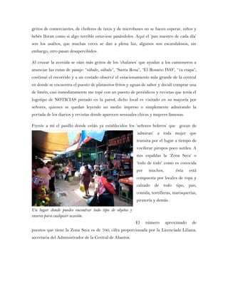 El documento describe un recorrido por la Central de Abasto en Oaxaca un sábado de plaza. La autora describe la gran cantidad de gente y comerciantes que abarrotan el lugar, ofreciendo todo tipo de productos. Se detalla la Zona Seca, con 700 puestos de ropa, calzado y comida, así como la Zona Húmeda y la zona de flores. Al final, la autora expresa admiración por los trabajadores de la central que laboran arduamente todos los días.