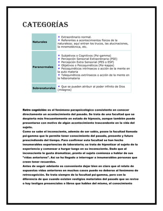 El documento discute los fenómenos paranormales y cómo existen facultades en el ser humano que van más allá de los cinco sentidos. Explica que los fenómenos paranormales no pueden explicarse por las leyes de la psicología experimental y parecen ser causados por una inteligencia no física. Además, clasifica diferentes tipos de fenómenos paranormales como la percepción extrasensorial, la psicoquinética y la retrocognición.