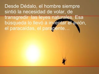 El documento habla sobre el parapente extremo como deporte que se practica lanzándose desde edificios de gran altura, corriendo riesgos. Explica brevemente el origen del parapente a finales de los 70's en los Alpes franceses. También menciona que un aventurero en Buenos Aires fue detenido después de lanzarse en parapente desde un edificio para evitar el tráfico.