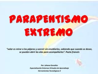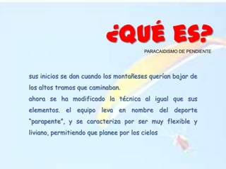 El parapente es un deporte de vuelo que se origina como una forma de descender de montañas, en el que el piloto se lanza desde una cima montañosa usando un parapente, un ala flexible ligera que le permite planear por los cielos. Para volar con parapente se necesita un ala, bandas, frenos, silla o arnés, casco y botas, mangas de viento. El despegue requiere correr desde la cima de la montaña y lanzarse al vacío atado al parapente. Este deporte conlleva peligros