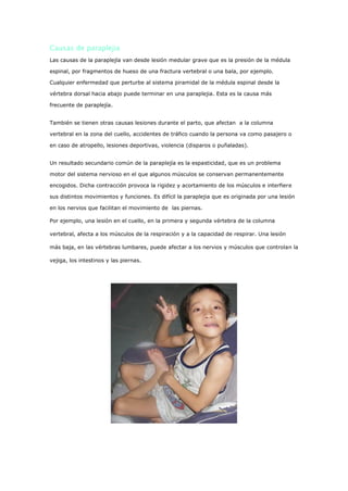 La paraplejía es la pérdida parcial o total de la capacidad de mover las piernas, generalmente como resultado de una lesión en la médula espinal o enfermedad congénita como la espina bífida. Los síntomas incluyen la falta de fuerza muscular en las piernas. El tratamiento depende de la causa y gravedad de la lesión y puede incluir medicamentos, terapia respiratoria y de rehabilitación. Aunque actualmente no existe cura para una médula espinal lesionada, en ocasiones la cirug