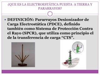 Este documento describe los pararrayos desionizadores de carga electrostática, también conocidos como sistemas de protección contra rayos. Funcionan transfiriendo cargas débilmente a tierra para disipar corrientes eléctricas generadas por fenómenos electrostáticos. Se instalan en lo más alto de las estructuras a proteger, sobresaliendo 2 metros, para desviar descargas atmosféricas de forma segura.