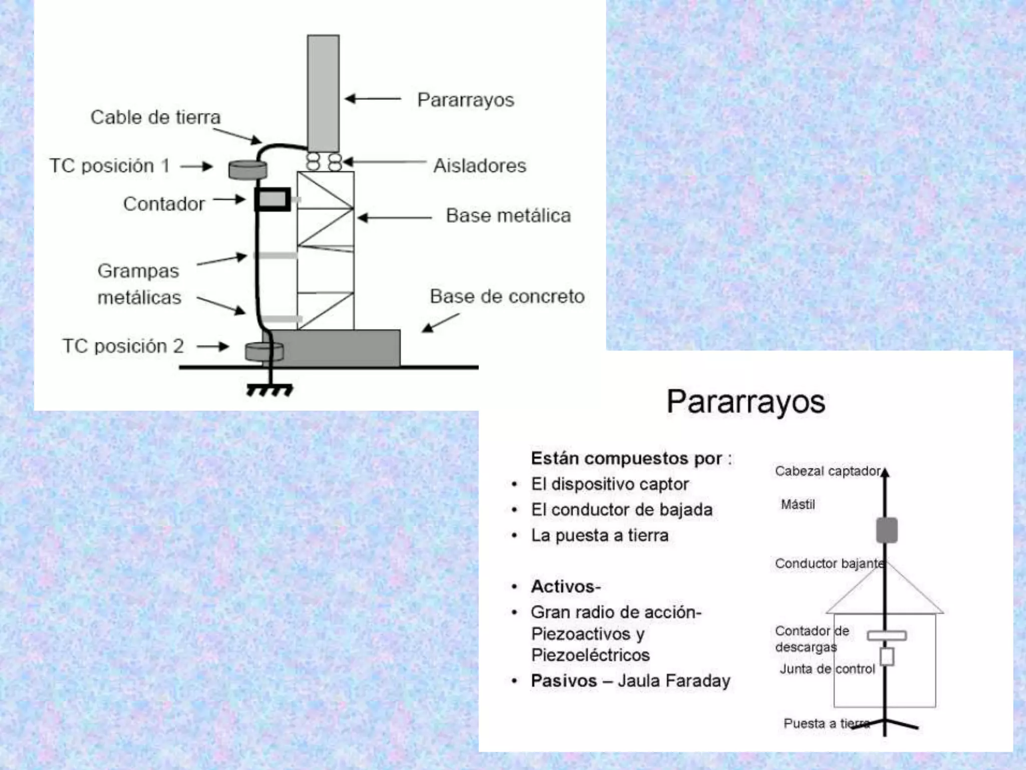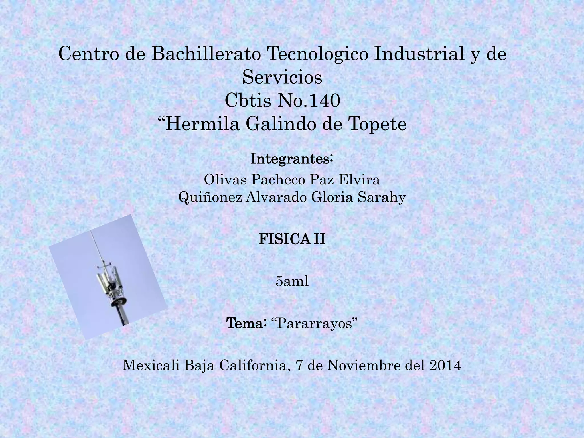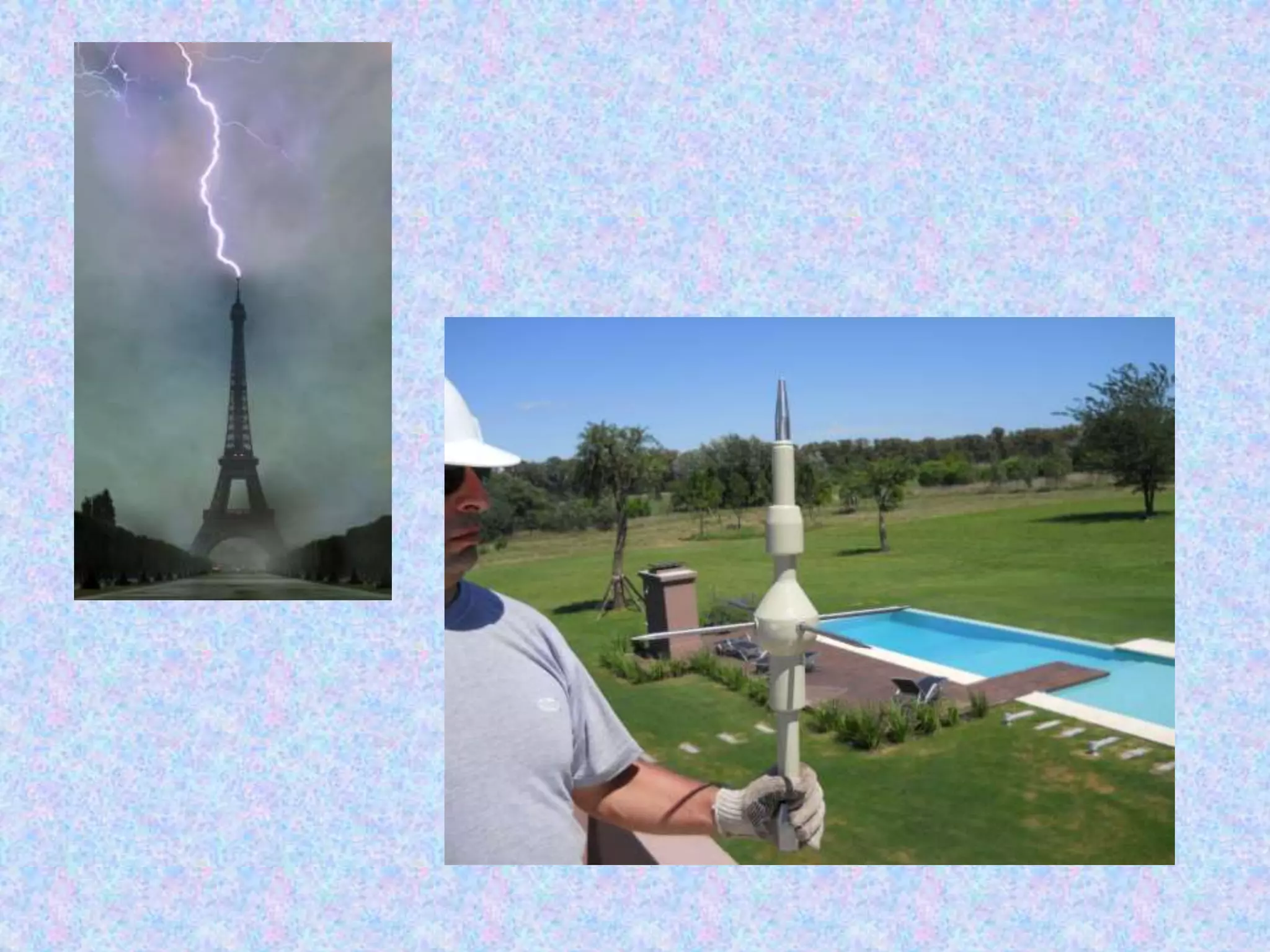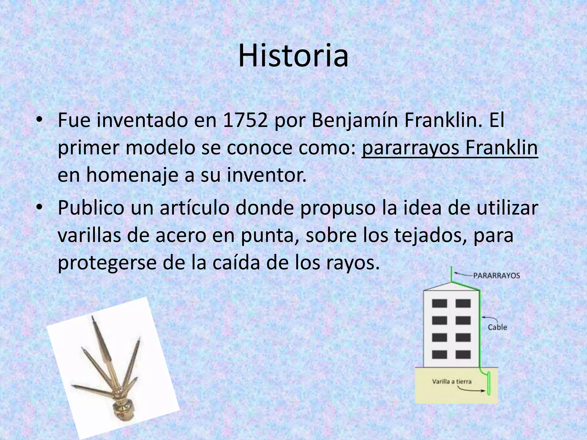 Benjamín Franklin inventó el pararrayos en 1752 como un instrumento para atraer rayos y conducir su descarga a tierra de forma segura. Un pararrayos típicamente consiste en una punta metálica larga conectada a un conductor que lleva la corriente del rayo a una toma de tierra para evitar daños a edificios o personas. Se coloca en lo más alto posible de una estructura para proteger un área amplia de los peligros de los rayos.