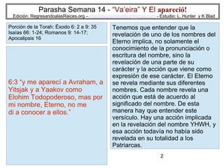El documento analiza la revelación del nombre de YHWH y su significado en relación con la relación de los patriarcas con el Eterno. Se enfatiza que, aunque conocían a Dios como El Shadai (Todopoderoso), no experimentaron su redención como tal, hasta que Moisés se encuentra con Dios en la zarza ardiente, quien se presenta como redentor para liberar a los israelitas de la esclavitud en Egipto. Se subrayan las promesas de redención y la importancia de los nombres de Dios en la Torá en relación con su carácter y acciones hacia su pueblo.