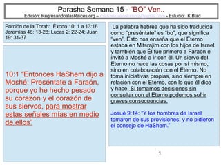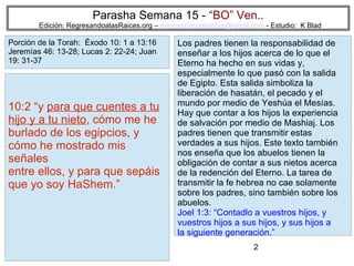 Este documento resume una porción de la Torá que describe la plaga de langostas en Egipto y las tinieblas que cayeron sobre el país. También discute la importancia de transmitir la fe a las generaciones futuras contando la historia de la liberación de Israel de Egipto y la necesidad de involucrar a los niños en las celebraciones religiosas. Finalmente, explica el significado del mes de Aviv como el primer mes del año para los israelitas.