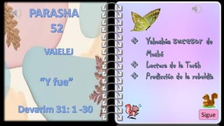 Mosheh les dice al pueblo de Israel que ya tiene 120 años y no podrá cruzar el río Jordán con ellos. Les presenta a Josué como su nuevo líder y les asegura que Yahweh estará con él para guiarlos y protegerlos. Mosheh instruye al pueblo a reunirse, incluyendo a los extranjeros, para escuchar y aprender la Torá y así honrar a Yahweh. Yahweh le advierte a Mosheh que el pueblo se apartará de él después de su muerte para seguir a otros d