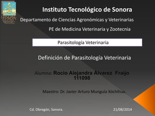 La parasitología veterinaria estudia la relación huésped-parásito a través de la morfología, ciclo de vida, epidemiología, clínica, diagnóstico, control y prevención de protozoos, helmintos, artrópodos y pentastomidos que afectan a animales domésticos. Se define como la ciencia que estudia los seres vivos capaces de vivir a expensas de otros organismos más desarrollados.
