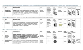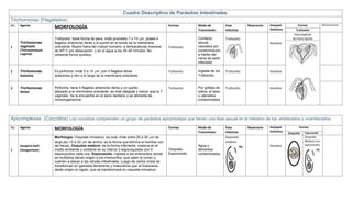 1. El documento describe la morfología y ciclo de vida de varios parásitos intestinales como Trichomonas, Isospora belli, Cryptosporidium, Balantidium coli, Blastocystis hominis, Ascaris lumbricoides, Trichuris trichiura, Enterobius vermicularis, Ancylostoma duodenale, Necator americanus, Taenia saginata, Taenia solium e Hymenolepis nana. Se incluyen detalles sobre sus formas, modo de transmisión, fase infectiva, huéspedes y form