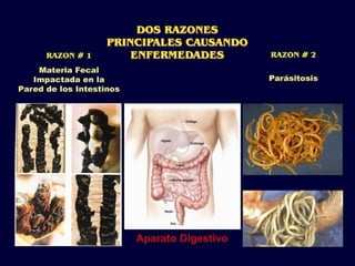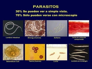 El documento habla sobre el parasitismo, que es la relación entre dos especies donde una, el parásito, vive a expensas de la otra, el huésped. El parasitismo intestinal ocurre cuando una especie vive dentro del tracto intestinal del huésped, compitiendo por la comida ingerida o alimentándose de la sangre del huésped adherido a las paredes intestinales, como en el caso del anquilostoma.