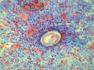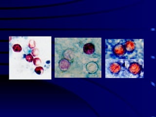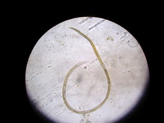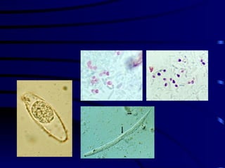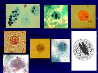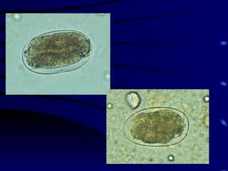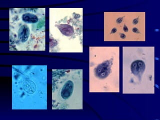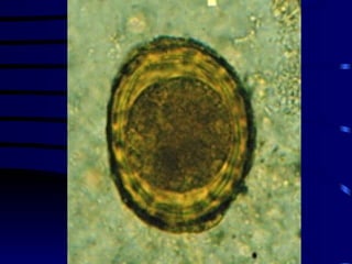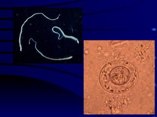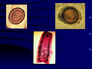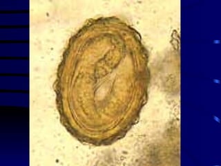 El documento proporciona información sobre parásitos intestinales. Explica que los parásitos incluyen protozoos como amebas y flagelados, así como helmintos como cestodos, trematodos y nematodos. Describe los mecanismos de transmisión, factores que inciden en la difusión, diagnóstico e implicaciones para la salud de diferentes parásitos.