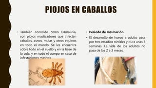 Este documento resume información sobre diferentes enfermedades parasitarias que afectan a los caballos, incluyendo piojos, jejenes, oxiurosis equina y Trichostrongylus axei. Describe los síntomas, ciclo de vida, fuentes de transmisión y tratamientos recomendados para cada condición.
