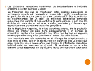 Este documento describe varias parasitosis intestinales comunes. Resume las características clínicas, etiológicas y de diagnóstico y tratamiento de la giardiasis, causada por el protozoo Giardia lamblia; la amebiasis, causada por el protozoo Entamoeba histolytica; y la criptosporidiosis, causada por el protozoo Cryptosporidium. Explica también brevemente la oxuiriasis, causada por el nematodo Enterobius vermicularis.