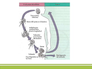 Este documento describe varias parasitosis comunes que afectan a niños, incluyendo ascariasis, giardiasis, amibiasis y cisticercosis. Describe los agentes causales, ciclos de vida, síntomas, diagnóstico y tratamiento de cada una. La ascariasis es causada por el nematodo Ascaris y es común en niños; la giardiasis por el protozoario Giardia lamblia; la amibiasis por Entamoeba histolytica y la cisticercosis por la larva de Taenia solium. Todas pueden