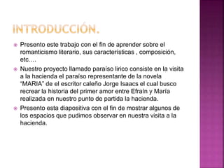 Este documento presenta un resumen de la visita a la Hacienda El Paraíso, el escenario de la novela María de Jorge Isaacs. La hacienda, ubicada a 36 km de Cali, fue construida entre 1816 y 1828 y declarada monumento nacional en 1959. La visita guiada permite revivir la historia de amor entre María y Efraín a través de los espacios de la casa como los rosales y cuartos, recreando las costumbres del siglo XIX en las haciendas colombianas.