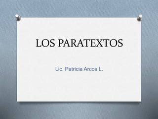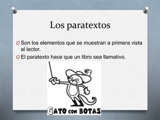 Los paratextos son elementos visibles que atraen al lector, como la colección, título, autor, editorial y portada. Además, incluyen paratextos internos como la dedicatoria, nombres de capítulos e ilustraciones que guían la lectura y ayudan a hacer predicciones sobre el contenido. Se sugiere un ejercicio para identificar y anotar estos paratextos junto a la portada.