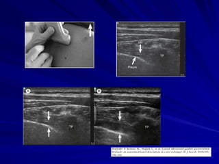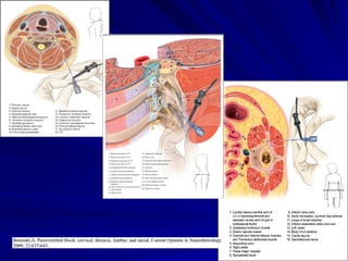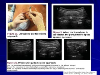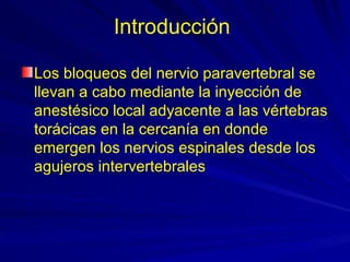 El documento describe la técnica del bloqueo paravertebral, incluyendo su anatomía, historia y usos. Se realiza mediante la inyección de anestésico local en el espacio paravertebral adyacente a las vértebras torácicas. Fue pionero Hugo Sellheim en 1905 y ha renovado interés en décadas recientes. Proporciona analgesia efectiva con pocos efectos secundarios, comparable a la analgesia epidural torácica. Es segura y eficaz para cirugía de mama, herniorrafia inguinal y