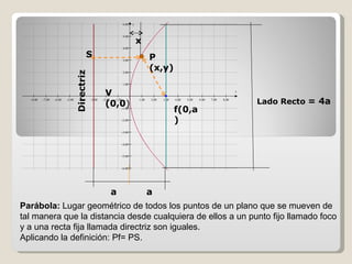 El documento describe las propiedades de las parábolas, incluidas su definición geométrica, ecuaciones en forma típica y general, y elementos como el foco y la directriz. También presenta ejemplos de problemas relacionados con parábolas que modelan antenas parabólicas, túneles, gárgolas y puentes colgantes.