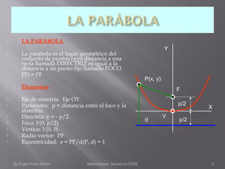 1. La parábola es el lugar geométrico de puntos cuya distancia a una recta directriz es igual a la distancia a un punto fijo llamado foco. Se describen los elementos de la parábola y se presentan ejemplos de hallar su ecuación a partir de los datos del foco, directriz y vértice.
