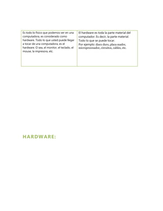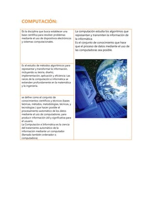 La computación estudia los algoritmos y métodos para representar y procesar información mediante dispositivos electrónicos y sistemas computacionales. Busca establecer una base científica para resolver problemas usando computadoras. Incluye el estudio de teorías, diseños, implementaciones y eficiencias de métodos algorítmicos. Sus raíces se extienden en matemáticas e ingeniería. El hardware son los componentes físicos de una computadora como el monitor, teclado y disco duro. El software son los programas y reglas que permiten ejecut