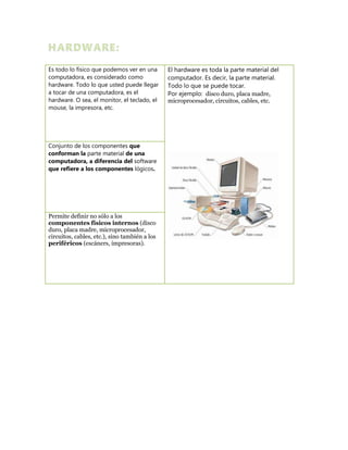La computación e informática estudia los algoritmos y métodos para representar, procesar y transmitir información digital mediante sistemas computacionales, con raíces en las matemáticas e ingeniería. Permite procesar datos automáticamente usando hardware físico como computadoras, y software lógico como programas e instrucciones, para producir información útil.