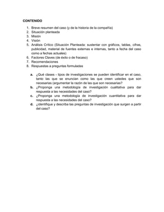 Este documento presenta un caso de investigación de mercados realizado por estudiantes de la Universidad de San Buenaventura para la empresa TruEarth Alimentos Saludables. TruEarth produce y comercializa pastas y pizzas refrigeradas hechas con granos enteros. El documento analiza la historia, situación y estrategia de la empresa, y propone recomendaciones basadas en investigaciones cualitativas y cuantitativas para mejorar el lanzamiento de nuevos productos como la pizza de grano entero.