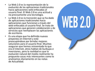 La Web 2.0 representa la evolución de las aplicaciones tradicionales a aplicaciones web enfocadas en el usuario final. Se trata de aplicaciones que generan colaboración y servicios que reemplazan las aplicaciones de escritorio. La Web 2.0 permite una mayor comunicación entre usuarios y contiene contenido que es constantemente actualizado por los propios usuarios.