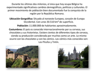 Bélgica es un país ubicado en el noroeste de Europa con una superficie de 30.510 km2 y una población de aproximadamente 11 millones de habitantes. Es conocido internacionalmente por su variedad de cervezas, chocolates y cómics como Los Pitufos y Tintín. Algunos de sus principales lugares turísticos son Namur, Lieja y Lovaina.